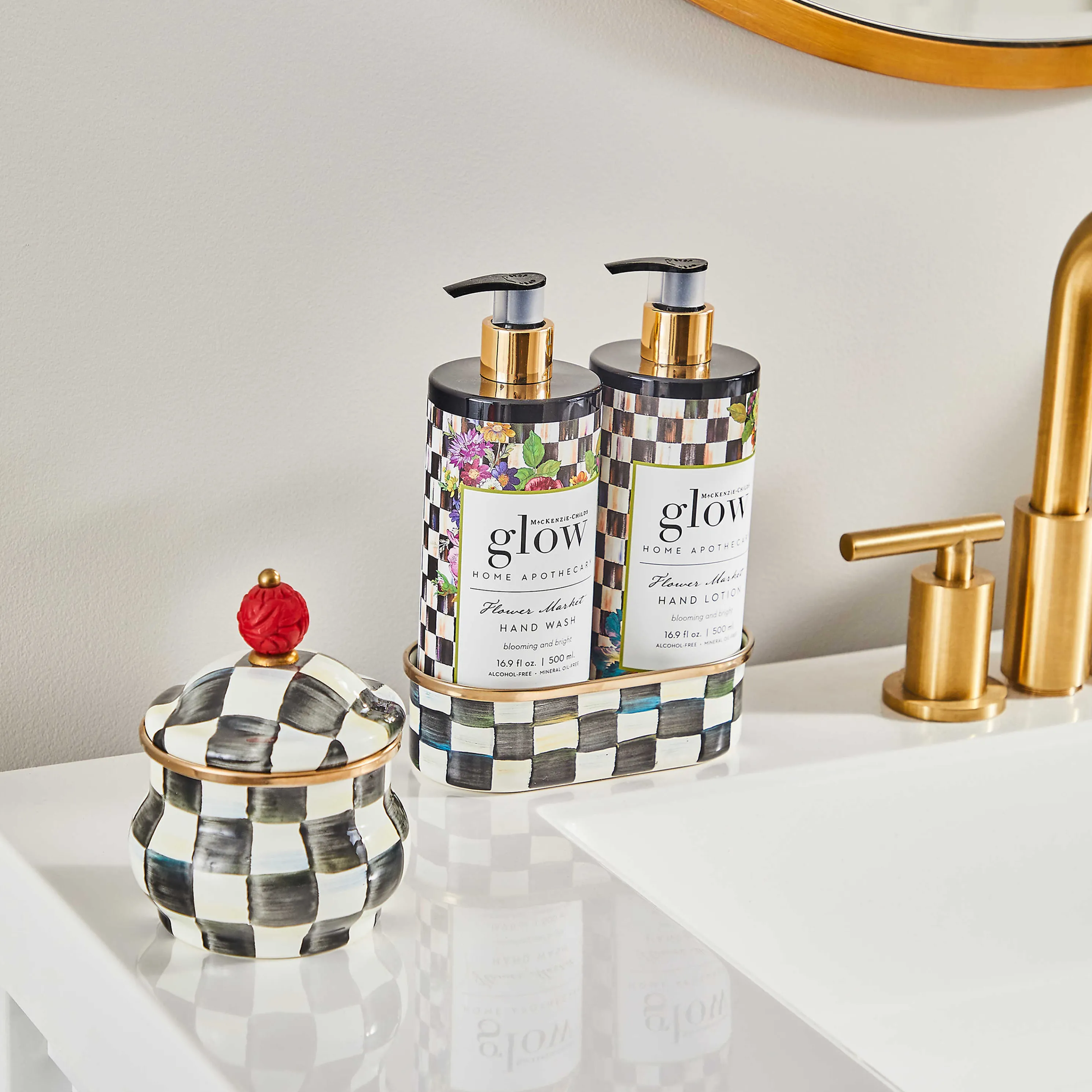 Mackenzie-Childs Glow Home Apothecary Defines The Essence Of Home With Fresh And Inviting Scents. Our Flower Market Soap & Lotion Caddy Set Includes Our Flower Market Hand Wash And Flower Market Hand Lotion Presented In A Courtly Check® Enamel Caddy. Each Product, Featuring A Blooming And Bright Blend Of Market-Fresh Bouquets With Light Musk And Woody Notes, Is Formulated From Natural Ingredients That Leave Your Hands Clean And Moisturized.