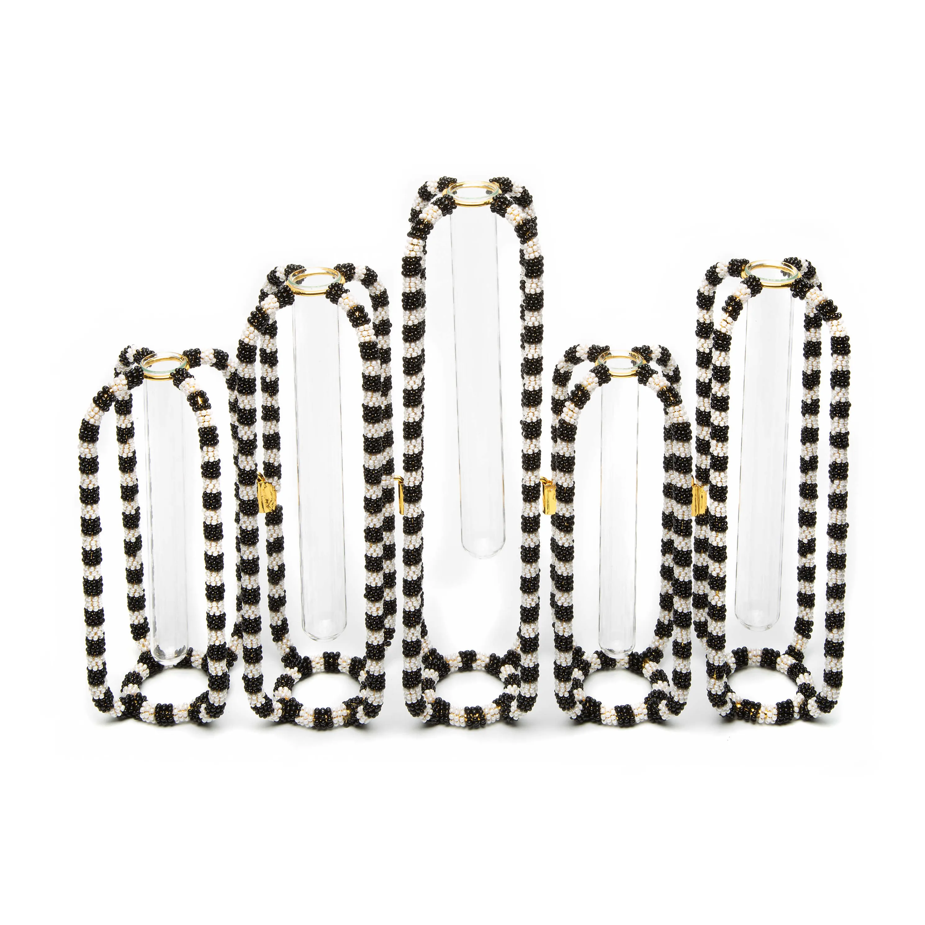 Present Flowers Or Store Pens And Pencils In Our Unique Set Of Five Interlocking Bud Vases. The Metal Frame, Which Is Decorated With Black And White Beads, Holds Individual Glass Vase Vials. Display Them Together Or Separately.