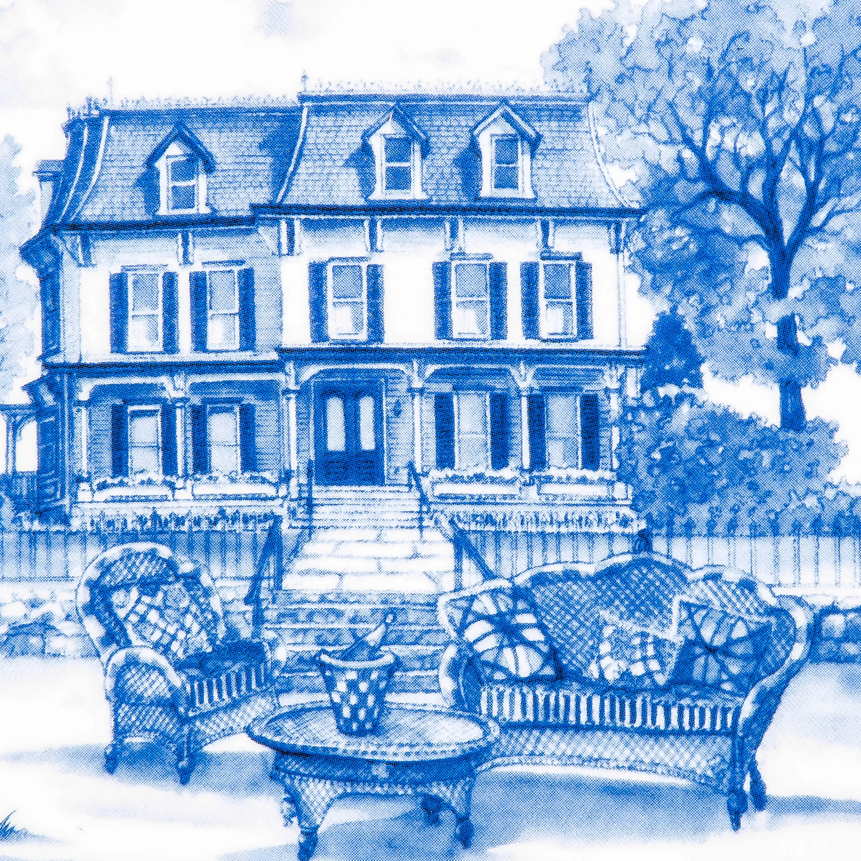 Serve In Mc Style With Our Ceramic Royal Toile Tray. It Features Our Farmhouse, Framed With A Border Of Blue Harlequin Checks, Trimmed With Gold Lustre Edging.