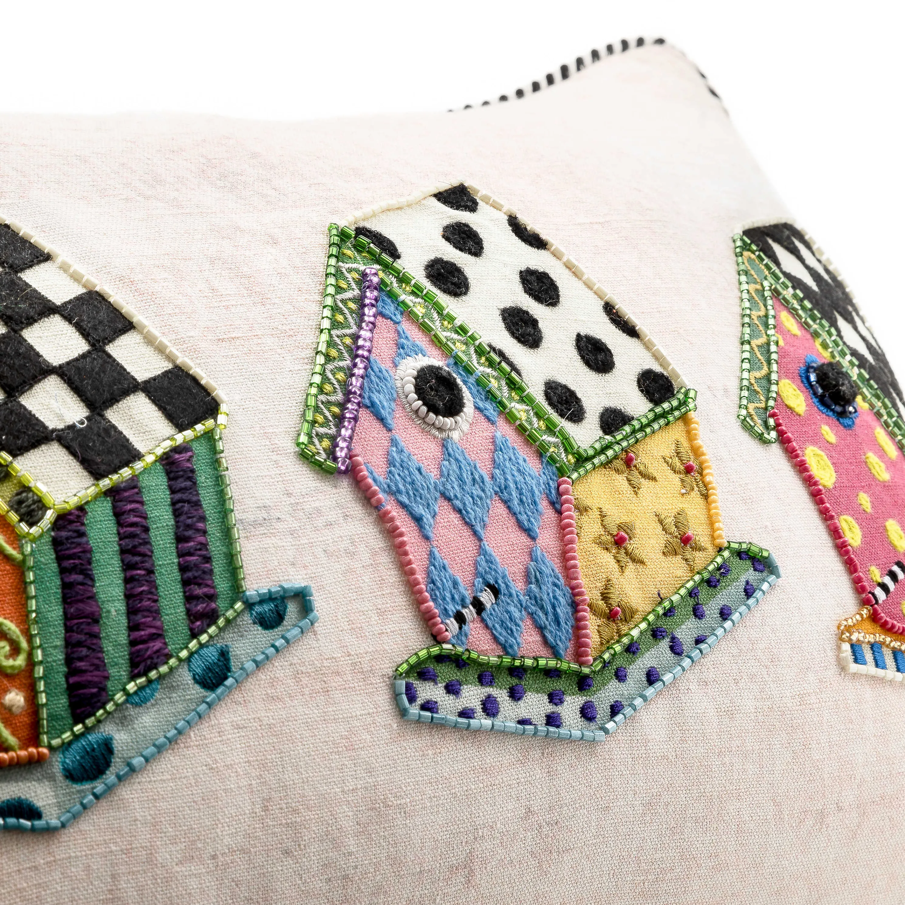 An Embroidered Trio Of Our Home Tweet Homes On A Cotton-Linen Front Accentuate The Bird House Lumbar Pillow. The Finishing Touch Is Twisted Black And White Cording.
