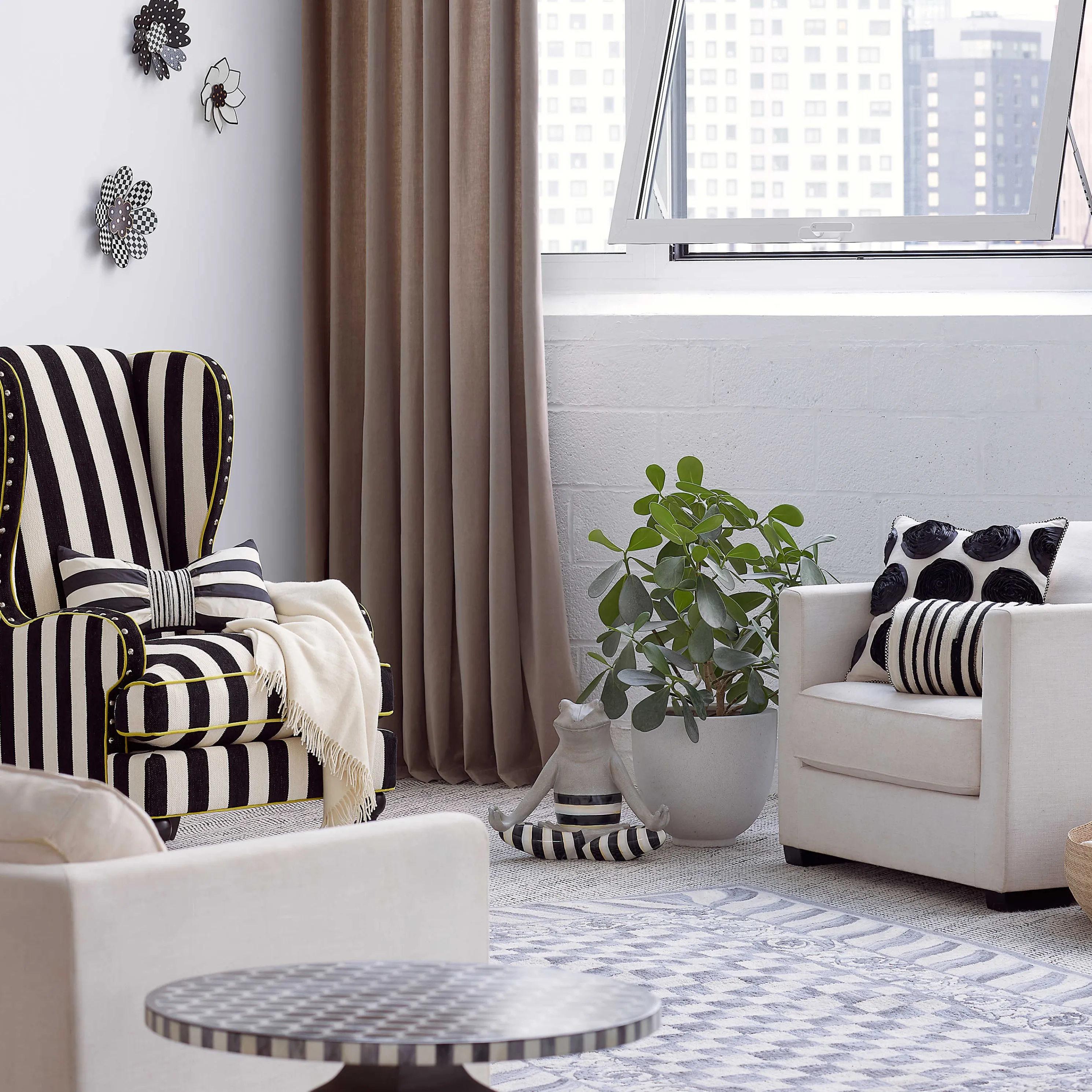 The Marquee Bolster Pillow Is A Versatile Addition To Our Spot On And Queen Bee Furniture Collections, Featuring Dimensional Stripes Done In Embroidery And Beads, Trimmed On Either End With Black And White Check Piping And Checked Buttons.