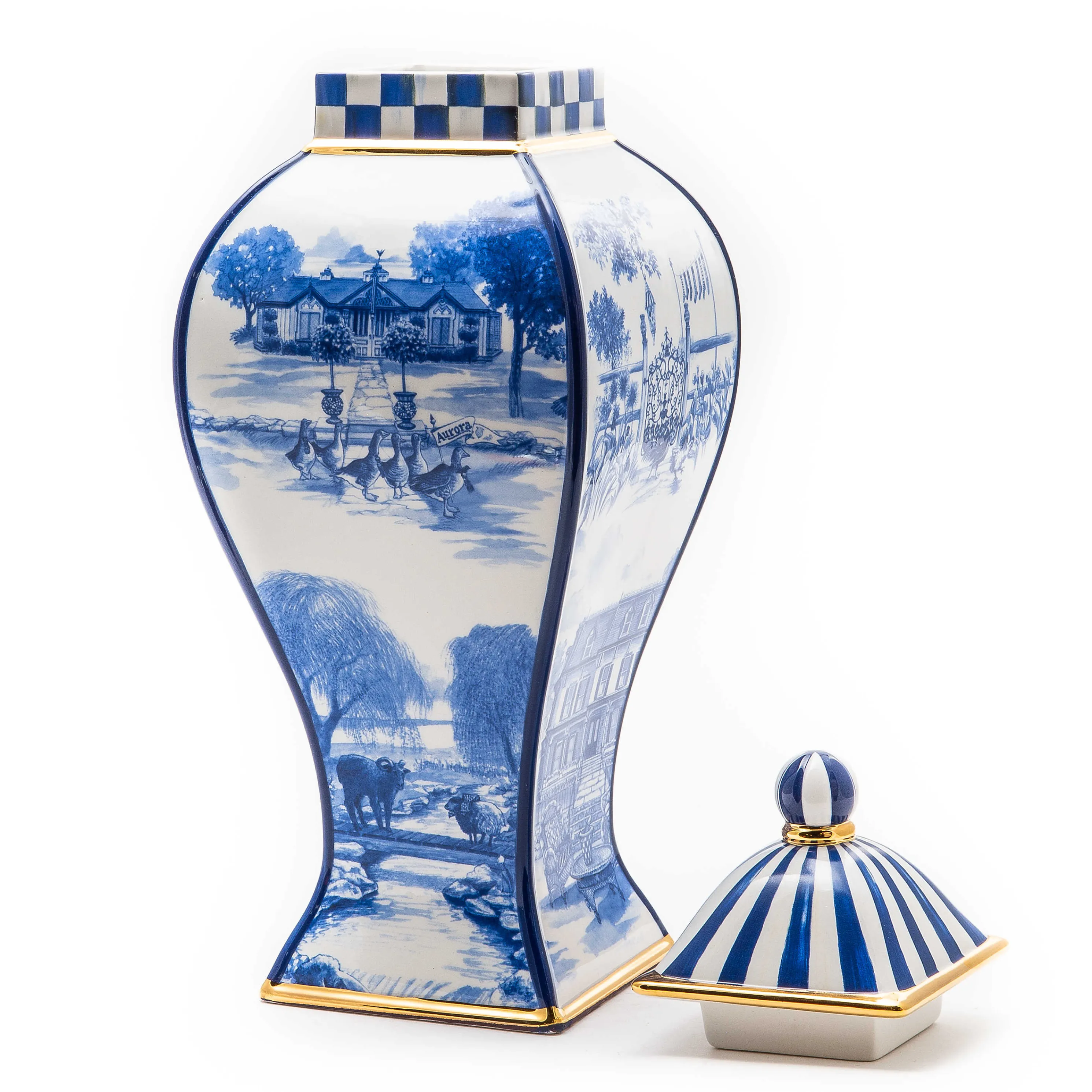 Our Ceramic Large Royal Toile Ginger Jar Offers Stylish Storage For Treasures And Trinkets. It’S Decorated With Scenes From Our Aurora Campus, Topped With A Striped Lid And Finial, And Trimmed With Gold Lustre.